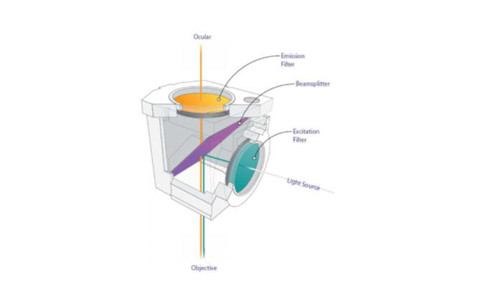 激發(fā)塊(cube)里面包含激發(fā)濾光片(EX)、二向分光鏡(DM)和發(fā)射濾光片(EM)。激發(fā)濾光片用于把光譜光源收窄成激發(fā)光波段,避免其他波段的光線進(jìn)入激發(fā)塊形成干擾;二向分光鏡既能反射激發(fā)光到樣品上,又能讓樣品發(fā)射光通過,到達(dá)發(fā)射濾光片;發(fā)射濾光片會把發(fā)射光以外的激發(fā)光、雜散光都過濾掉,從而讓用戶更清晰地觀察目標(biāo)熒光標(biāo)記。